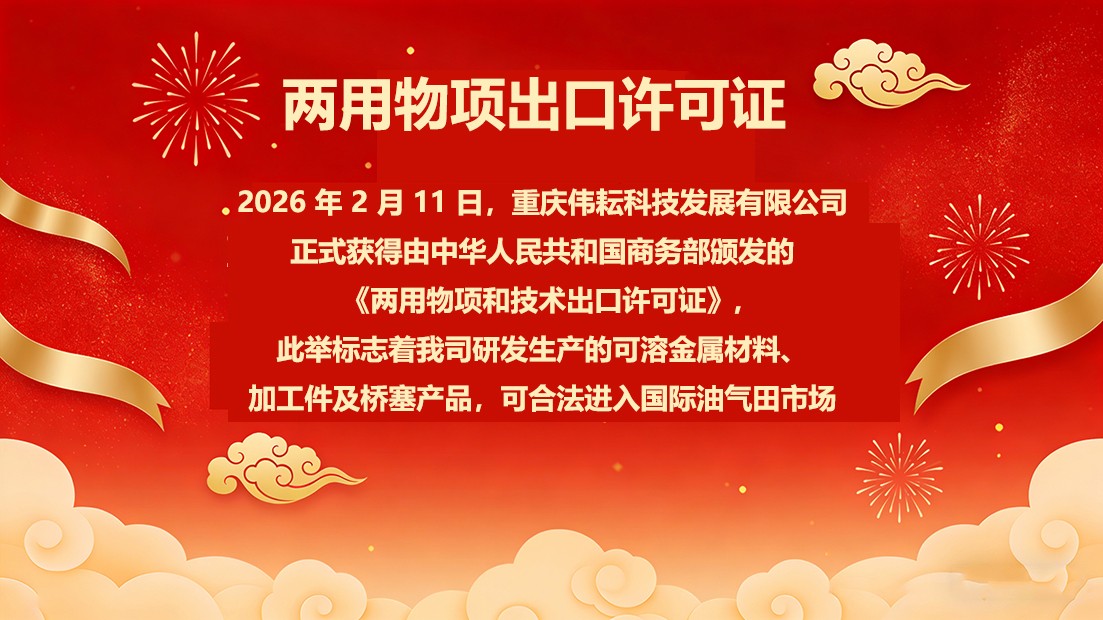 重慶偉耘科技發(fā)展有限公司于2026年2月11日正式獲得由中華人民共和國商務(wù)部頒發(fā)的《兩用物項(xiàng)和技術(shù)出口許可證》。這一重要資質(zhì)的取得,標(biāo)志著公司在合規(guī)經(jīng)營、技術(shù)實(shí)力及國際業(yè)務(wù)拓展能力上邁上了新臺(tái)階,為后續(xù)我司可溶材料,可溶材料加工件及可溶橋塞等可溶制成品合法合規(guī)向海外市場推廣奠定了堅(jiān)實(shí)的法律基礎(chǔ)。